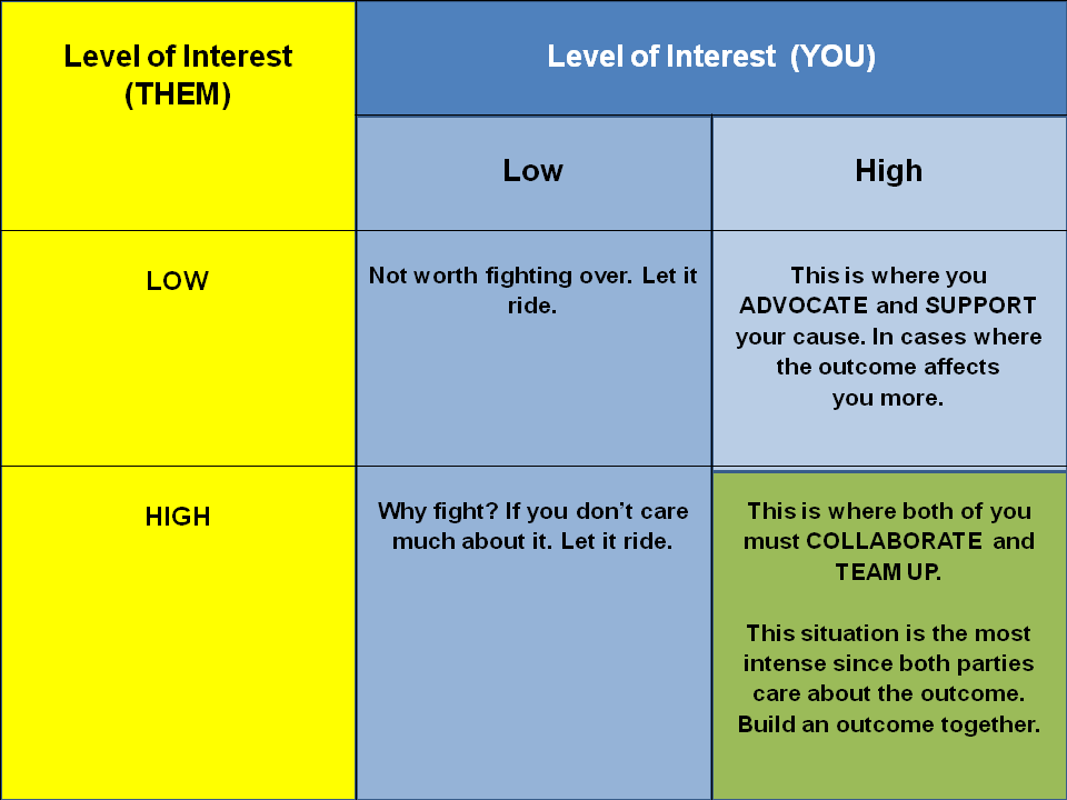 We all want to hold our ground. But ask yourself, is it worth it? An easy way to avoid conflict is to evaluate how much interest you have in the outcome versus that of the other party. Know where you are in this table.