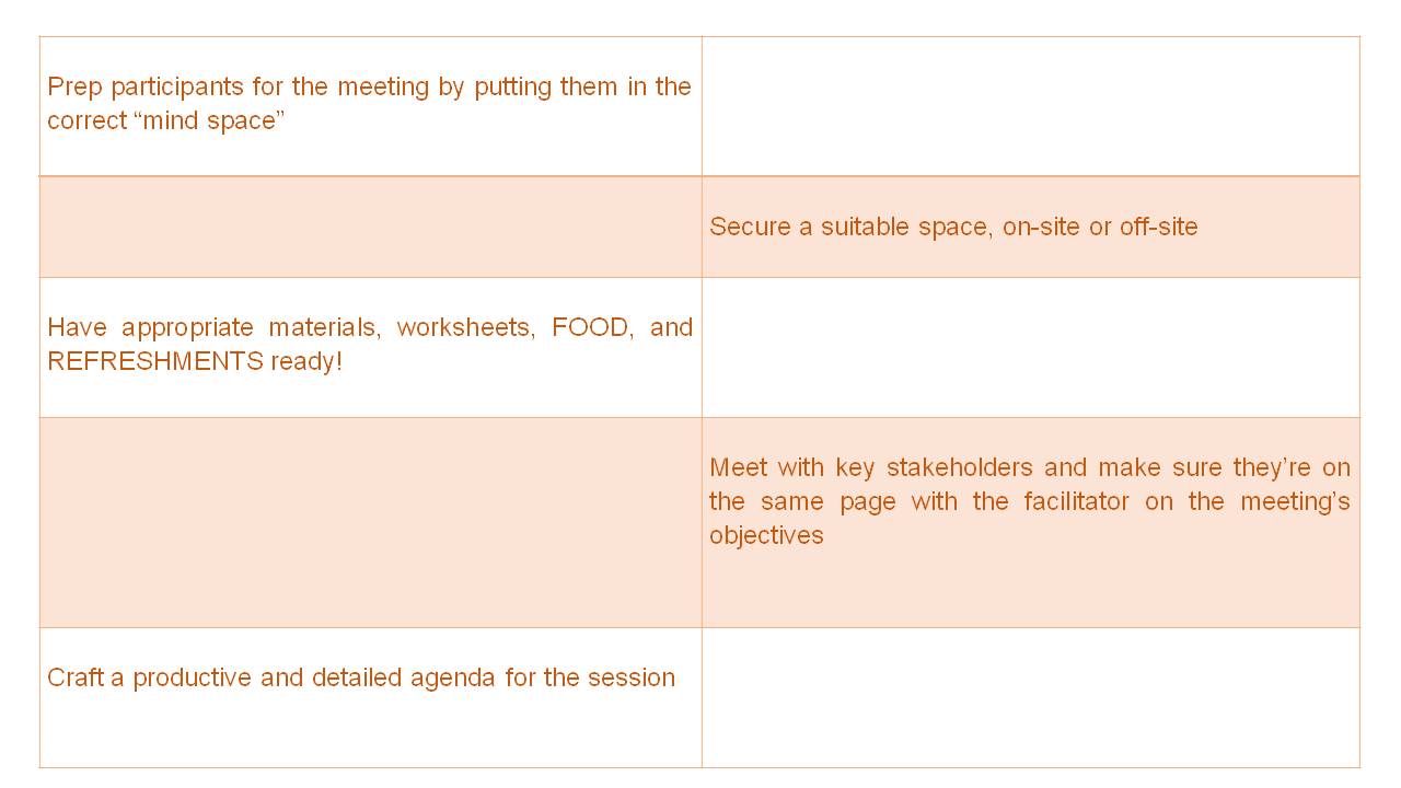 Preparation goes beyond prepping handouts and learning modules. Facilitators have to know the end goal and the checkpoint goals that must be ticked off along the way. Facilitators must create an environment for success by appraising whether the time allocated is realistic, whether the right people are present, and if the necessary materials are within reach.