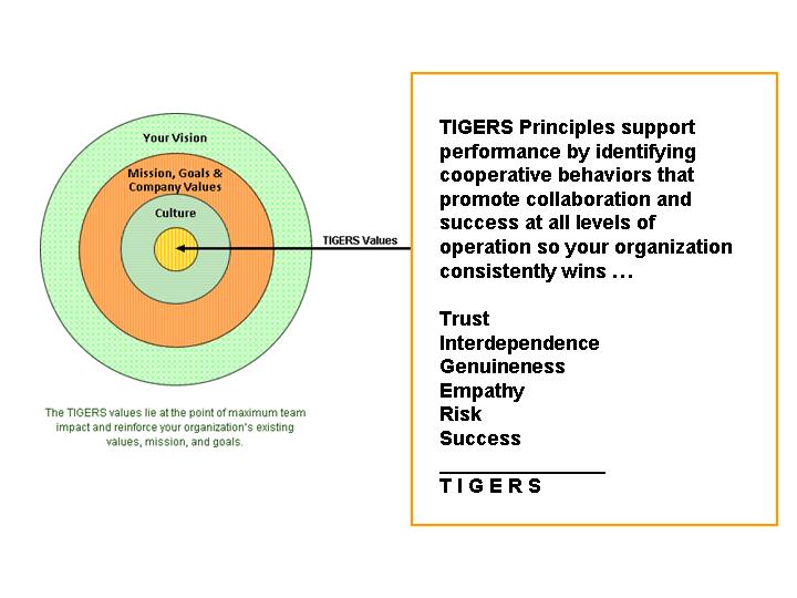 Risk is the fifth TIGERS® principle required for high performance team work and for building a cooperative and collaborative work culture capable of innovation. The other five principles are trust, interdependence, genuineness, empathy and success. They form the acronym, TIGERS®.